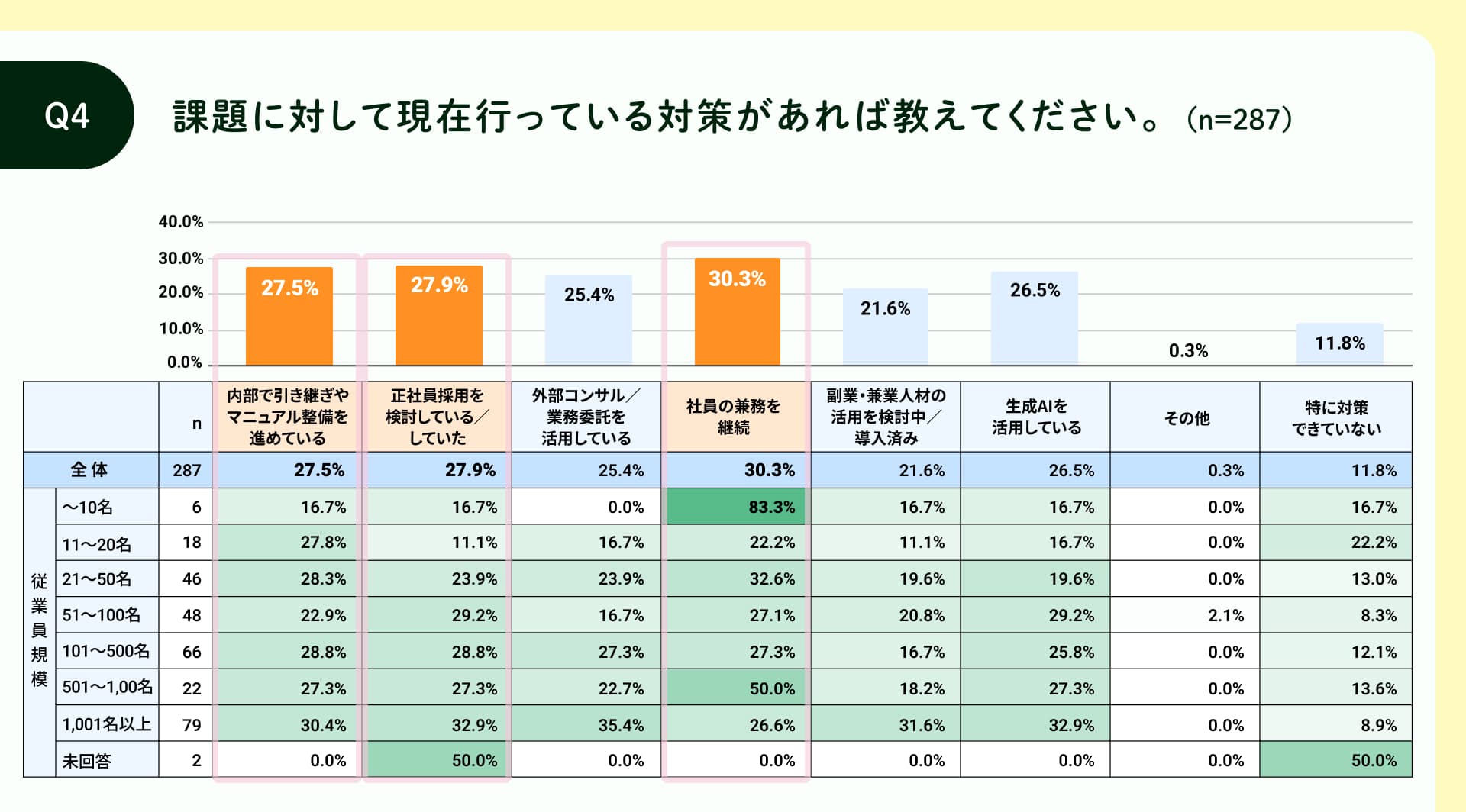 専任不在により生じている課題への対策を尋ねたところ、全体では「社員の兼務を継続(30.3%)」が最多で、次いで「正社員採用を検討している/した(27.9%)」、「内部で引き継ぎやマニュアル整備を進めている(27.5%)」が挙がる一方で、11.8%は「特に対策できていない」と回答しました。