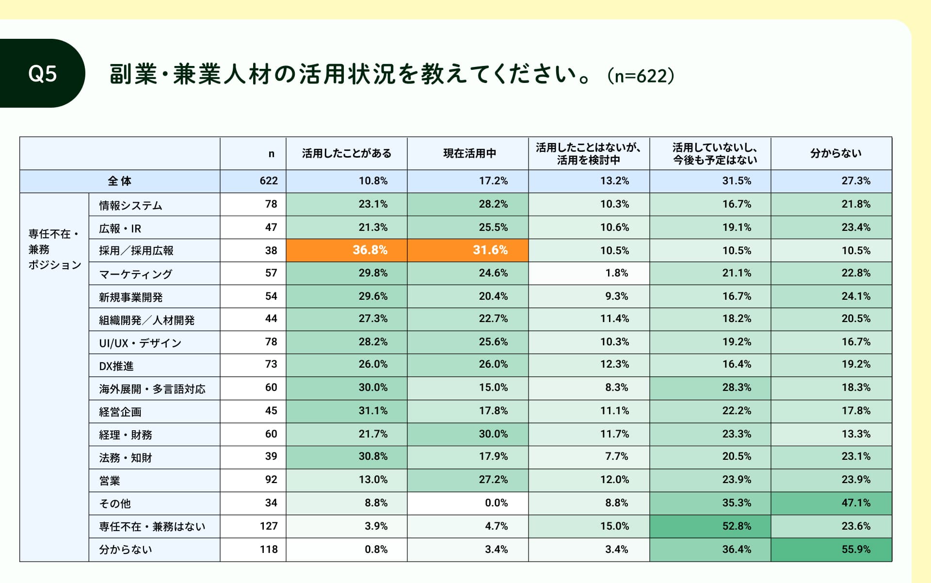 さらに、専任不在ポジションと副業人材の活用状況の関係性を見てみると、副業人材を活用していると回答した人のうち、専任不在と回答した割合が最も高い割合(36.8%)を示したのは「採用広報」の職種でした。採用広報は継続的な取り組みが求められますが、他の業務との兼務では十分なリソースを割くことが難しくなります。副業人材を活用することで短期間での施策実装や運用改善が可能となり、結果として組織全体の採用力強化にもつながると考えられます。