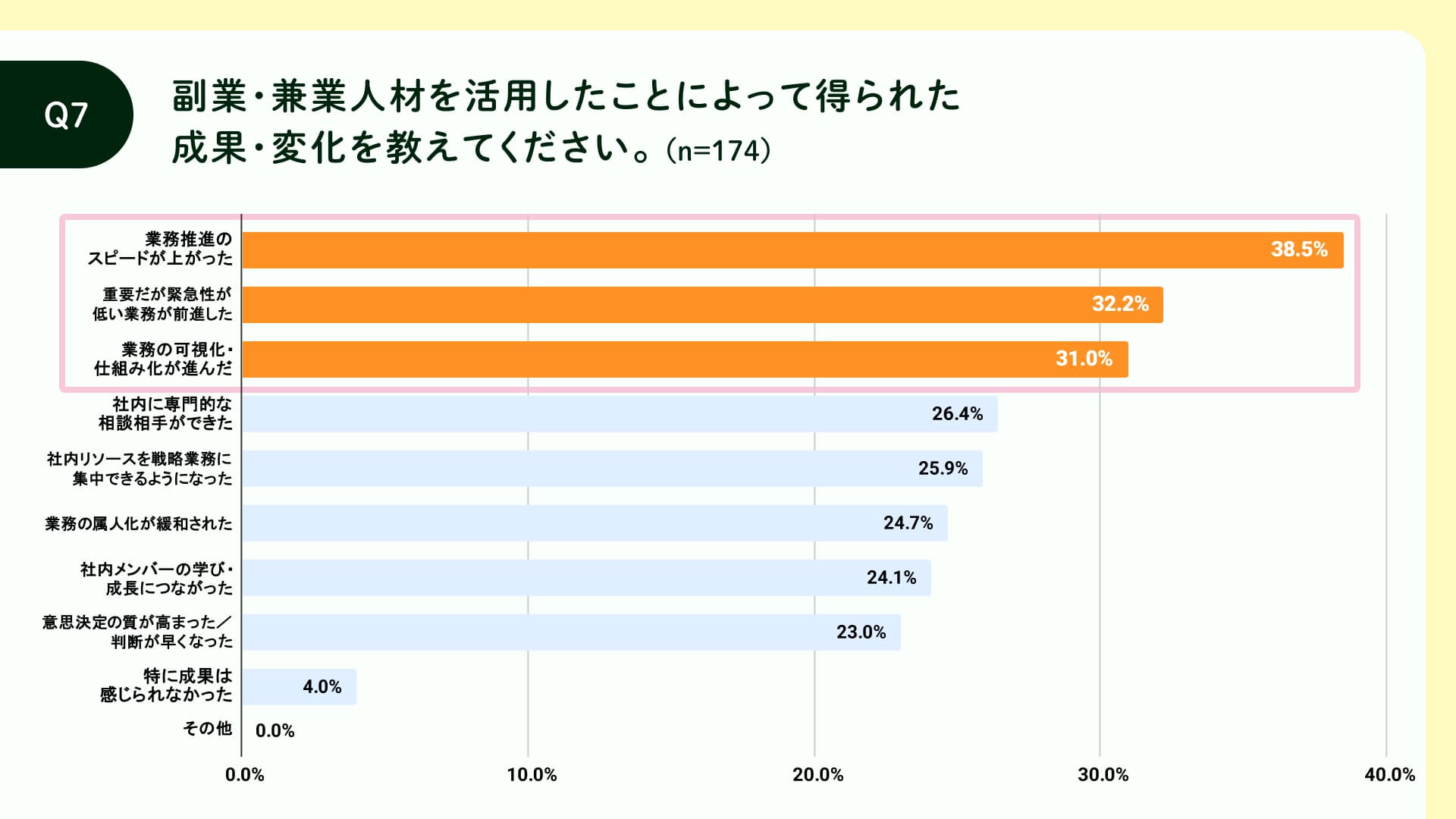 この結果から、副業人材の採用は、人材不足を補う一時的な対応ではなく、業務を加速し、組織をより持続的に成長させるための実効性ある手段として活用されている実態が明らかになりました。