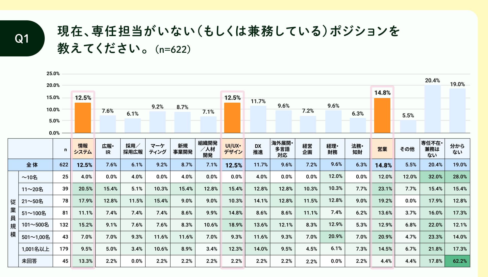 ・”専任不在”となっていることが多いのは“営業・情シス・デザイン”。企業の基盤領域に空白